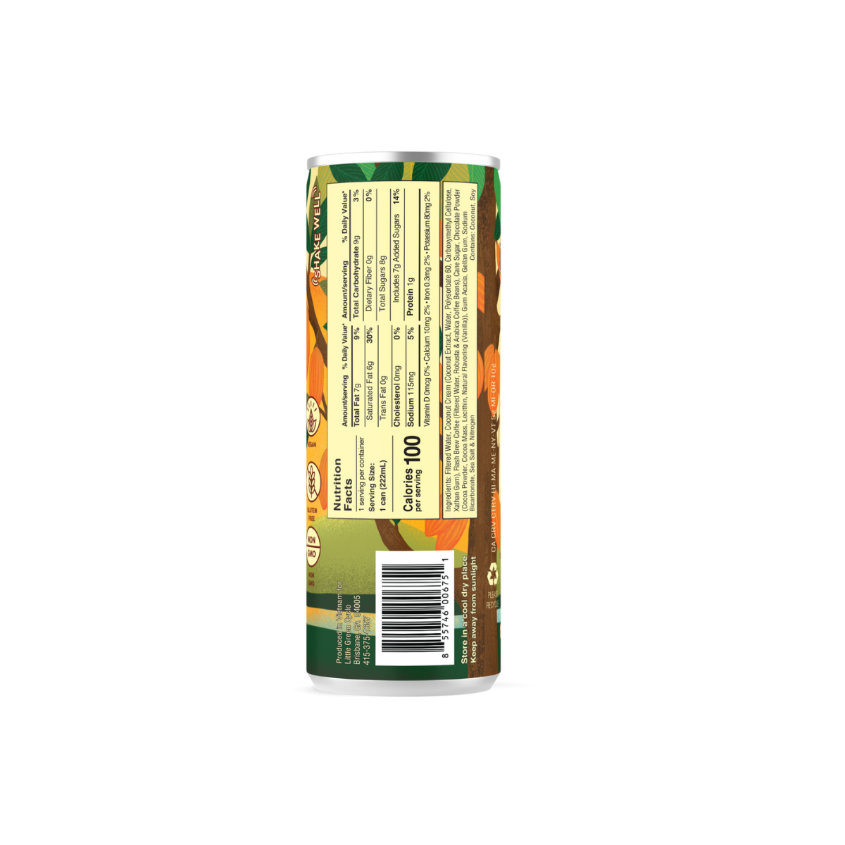 Filtered Water, Coconut Cream (Coconut Extract, Water, Polysorbate 60, Carboxymethyl Cellulose, Xathan Gum), Flash Brew Coffee (Filtered Water, Robusta & Arabica Coffee Beans), Cane Sugar, Chocolate Powder (Cocoa Powder, Cocoa Mass, Lecithin, Natural Flavoring (Vanilla)), Gum Acacia, Gellan Gum, Sodium Bicarbonate, Sea Salt & Nitrogen